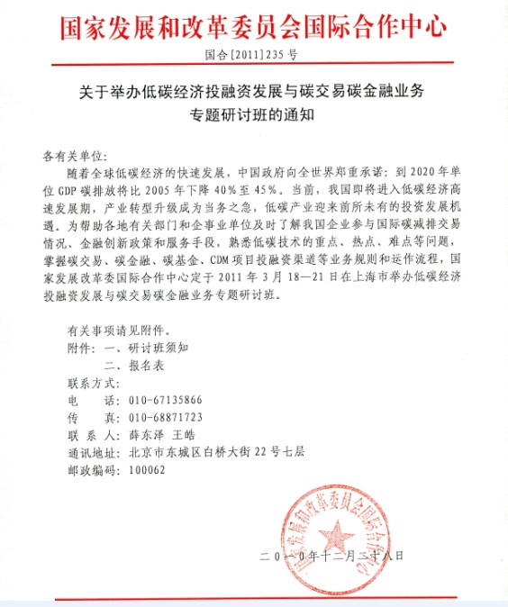 經國家發改委國際合作中心授權,現將國合【2011】235號文件關于2011年3月18日—21日在上海市舉辦“低碳經濟投融資發展與碳交易碳金融業務專題研討班”通知轉發如下, 屆時將邀請國家發改委能源所、國務院發展研究中心、清華大學、財政部清潔發展機制基金管理中習等有關單位領導專家,現場授課交流,歡迎各會員單位報名參加。具體可與本站聯系方式中明確的郵件及電話聯系,也可直接與附件中會務組聯系。